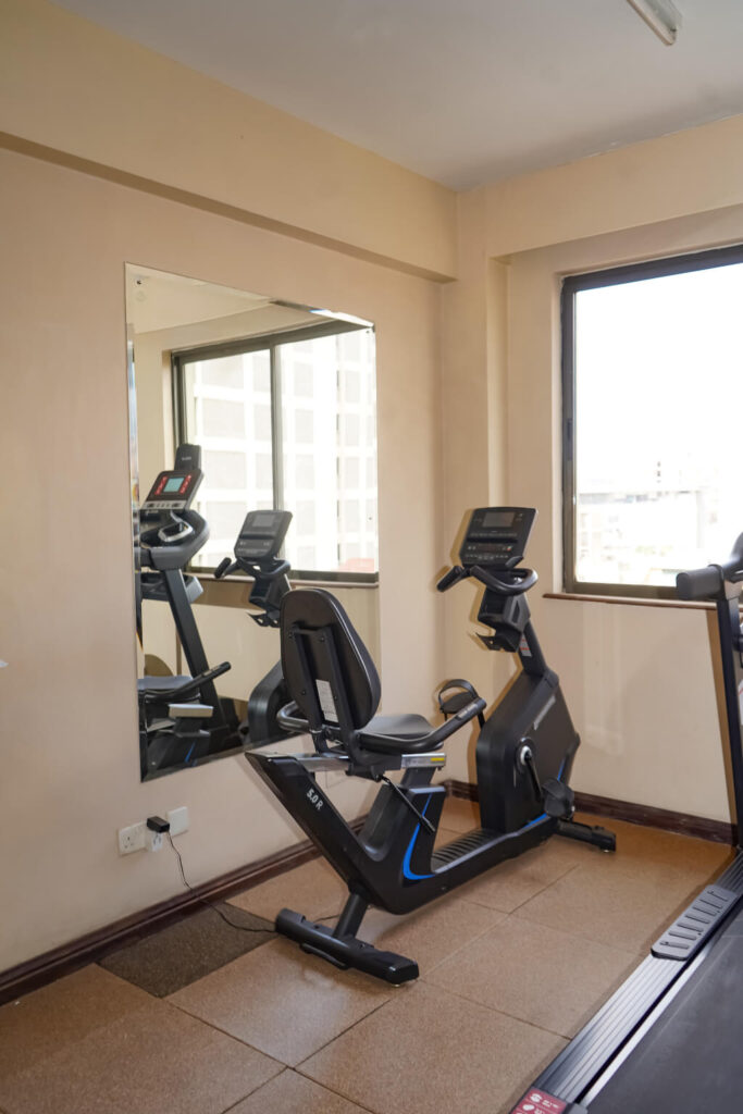 The gym features a selection of essential fitness equipment designed to support both cardio and strength workouts. Whether you want to start your day with a refreshing morning workout or unwind with an evening exercise session after meetings or exploring Nairobi, the gym offers a comfortable and accessible environment to stay active.